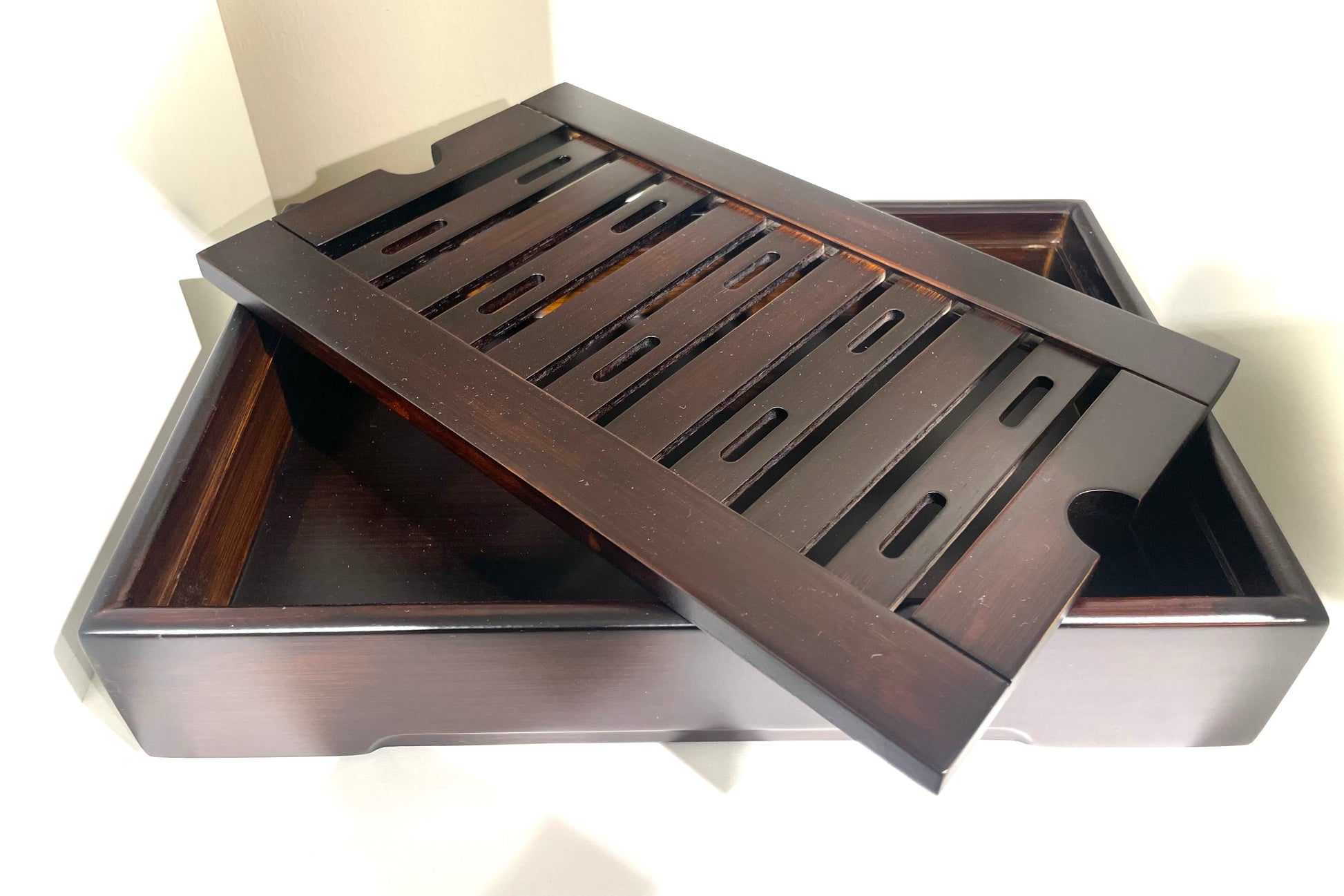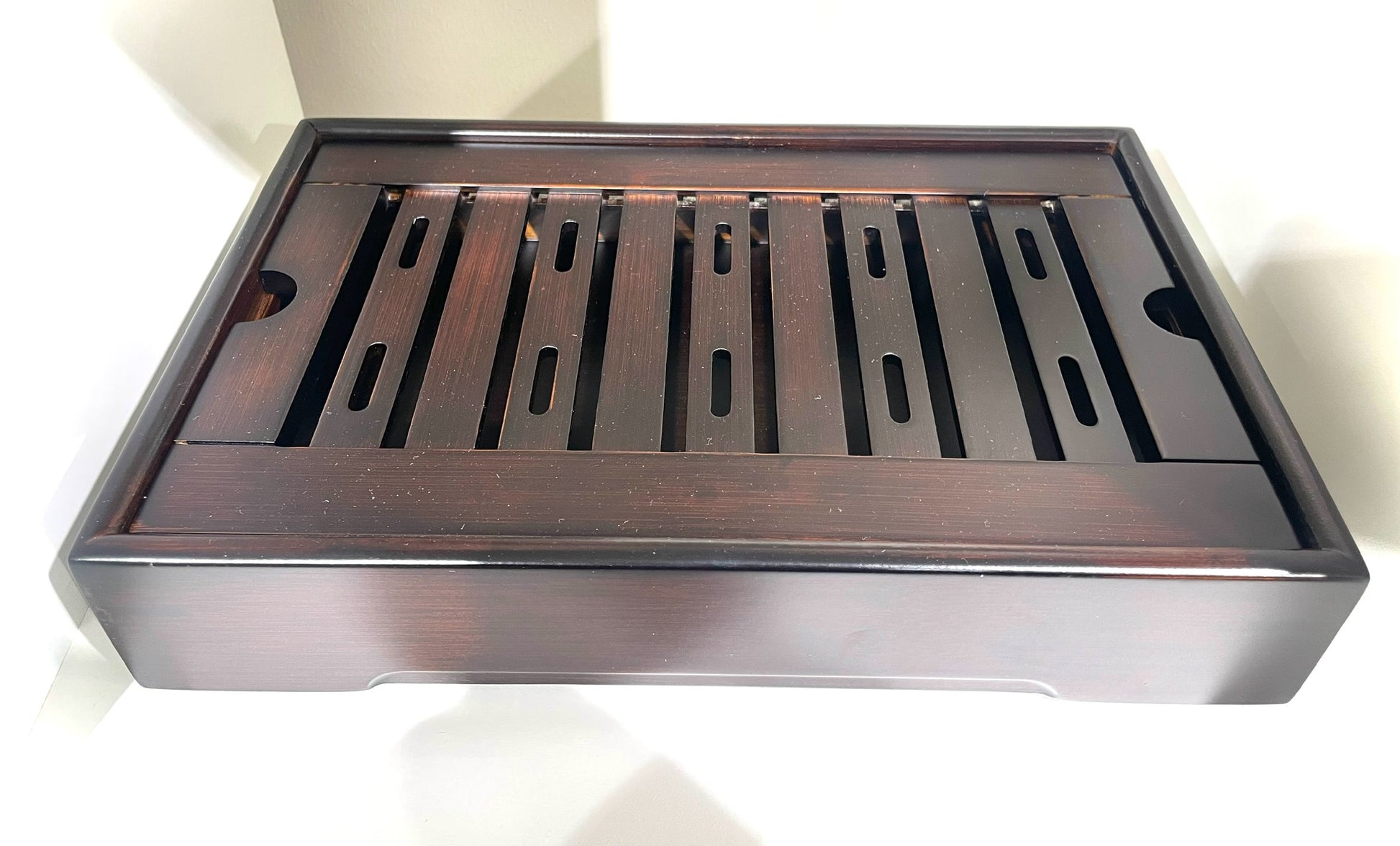 Kleiner brauner Teetisch aus lasiertem Bambus. Ideal, um einem kleinen Kung Fu Cha Setting Platz zu bieten.
