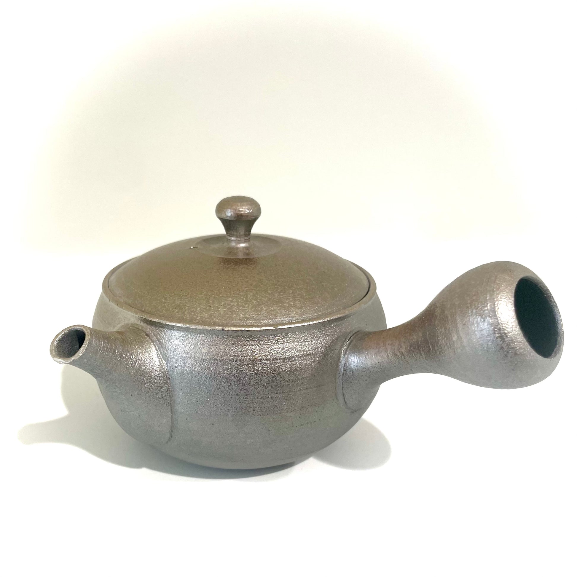 Diese schöne japanische Einhandkanne (Kyūsu) besteht aus rauem Tokoname Ton und ist mit einer Glasur aus glänzendem Mica (wird oft in Kosmetik verwendet), welche der Kanne einen silbrigen Glanz verleiht. Ein tolles Stück für Liebhaber von Schattentee!