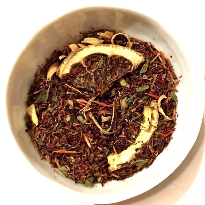 Das Feuer der roten Bitterorangen und die ätherische Frische der Minze bilden auf der Basis von Rooibos eine köstliche Kombination. Wir haben viele Kunden, die diesen fröhlichen Tee immer wieder nachkaufen. Kein Wunder, denn man bekommt einfach gute Laune beim Teetrinken.