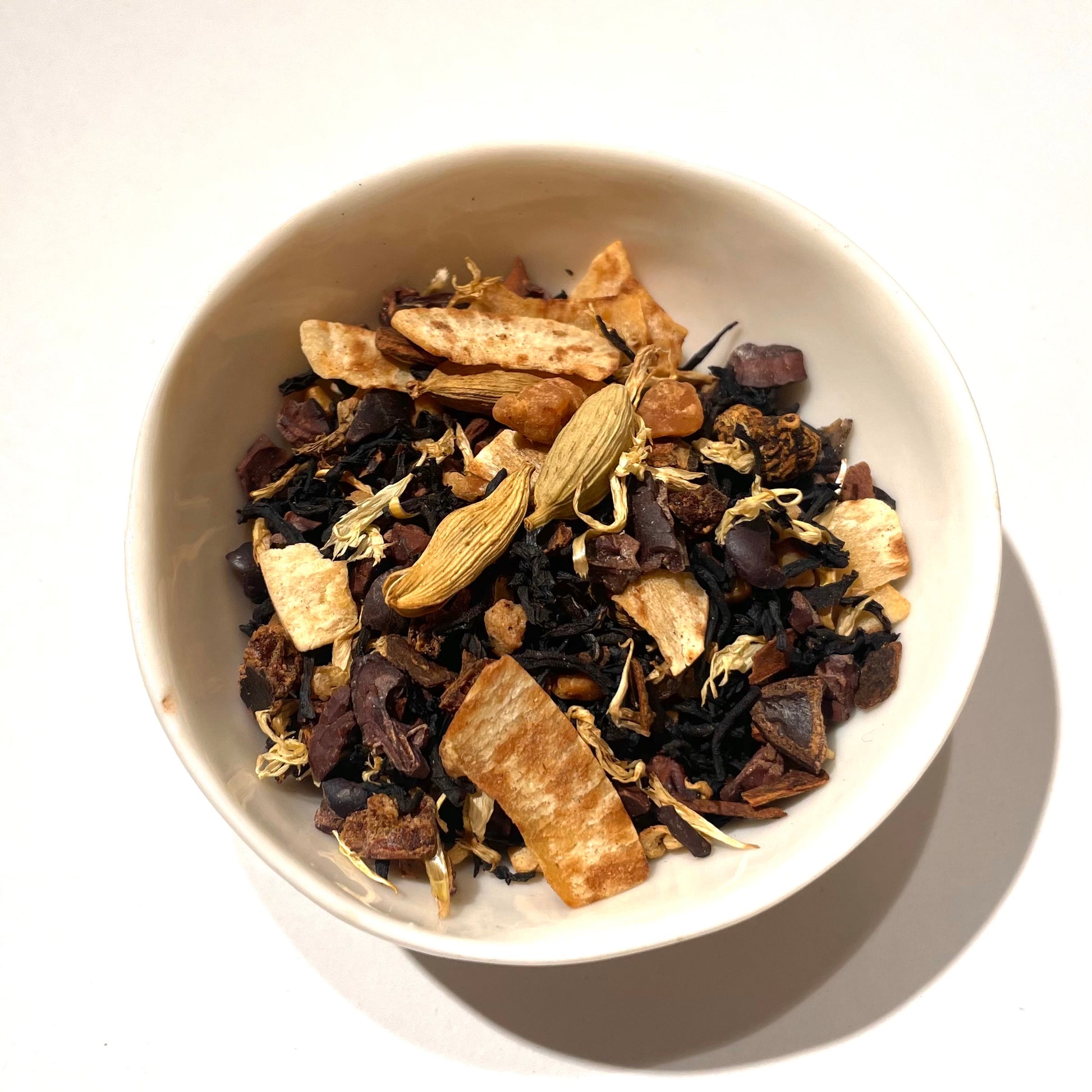 Zutaten: Schwarzer Tee (30 %), Kakaokerne, Zimt, Johannisbrotstücke, Kokos-Chips, Aroma, Krokantstücke (Zucker, Haselnüsse), Mandeln gehackt, Kardamomfrüchte, Macadamianüsse (Macadamia, Zucker), Scotch Whisky (1 %), Kornblumenblütenblätter, Eichenholz-Extrakt (0,5 %), natürlicher Bourbon Vanille-Extrakt